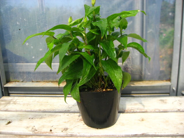 葉のわきに、直径2~3cmで紫色の斑点のある花を1~3輪上向きに咲かせます。茎はふつう枝分かれせず、まっすぐか斜めに伸び、場所や地域によっては弓なりに垂れることもあります。